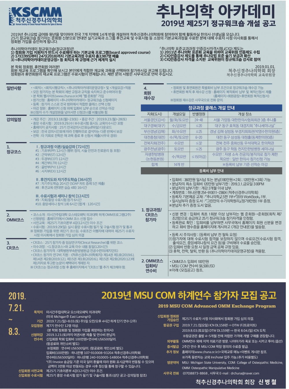 ·코스소개 : 미시간주립대학 오스테오패틱 의과대학 하계 OMM프로그램(2주) ·신청방법 : 홈페이지에서 OMM 코스 신청 접수 ·사전교육 : 제25기 기초이론부 4강(12시간) 이수 조건 ·수료시험 : 2019.9.29. 실시 중앙 수료시험 필기 및 구술시험 참가 및 통과 ※정회원 가입을 위한 최단기 코스. 수료자 사정 이사회에서 정회원 가입 심의. |