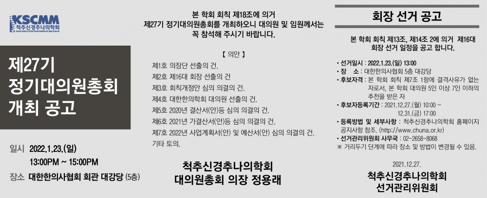 본 학회 회칙 제18조에 의거 제27기 정기대의원총회를 아래와 같이 개최하오니 16대 대의원 및 임원께서는 꼭 참석해 주시기 바랍니다. |